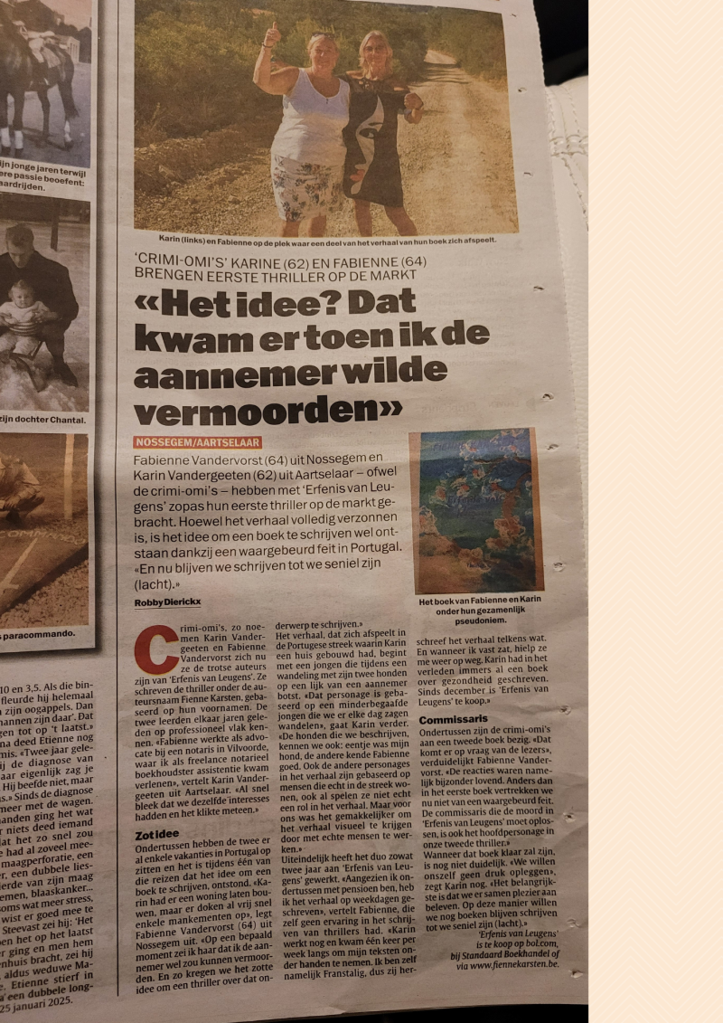 Fabienne Vandervorst (64) uit Nossegem en Karin Vandergeeten (62) uit Aartselaar, twee vriendinnen die zichzelf de ‘crimi-omi’s’ noemen, hebben hun eerste gezamenlijke boek geschreven onder de auteursnaam Fienne Karsten. Hun debuutthriller, Erfenis van leugens, neemt de lezers mee naar het pittoreske Portugal, waar alles draait rond een raadselachtige moordzaak. De auteurs haalden inspiratie uit hun persoonlijke reiservaringen en hun liefde voor misdaadverhalen.